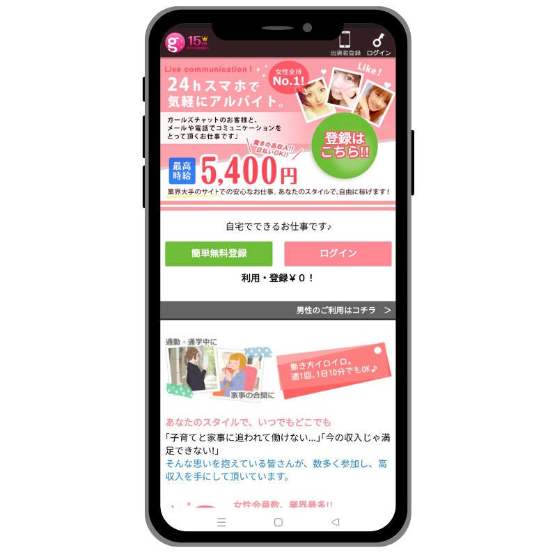 ガールズチャットは、PCが無くても、スマホひとつで最大時給5,400円が目指せるチャットサイト。