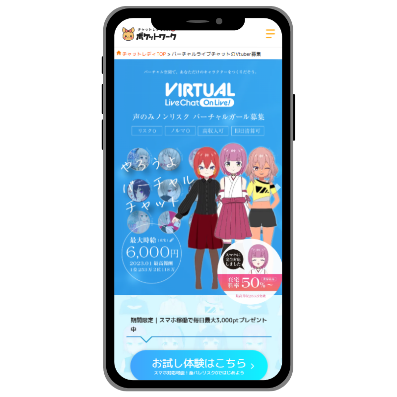 「ポケットワーク」ならスマホ専用バーチャルチャットがありますよ。